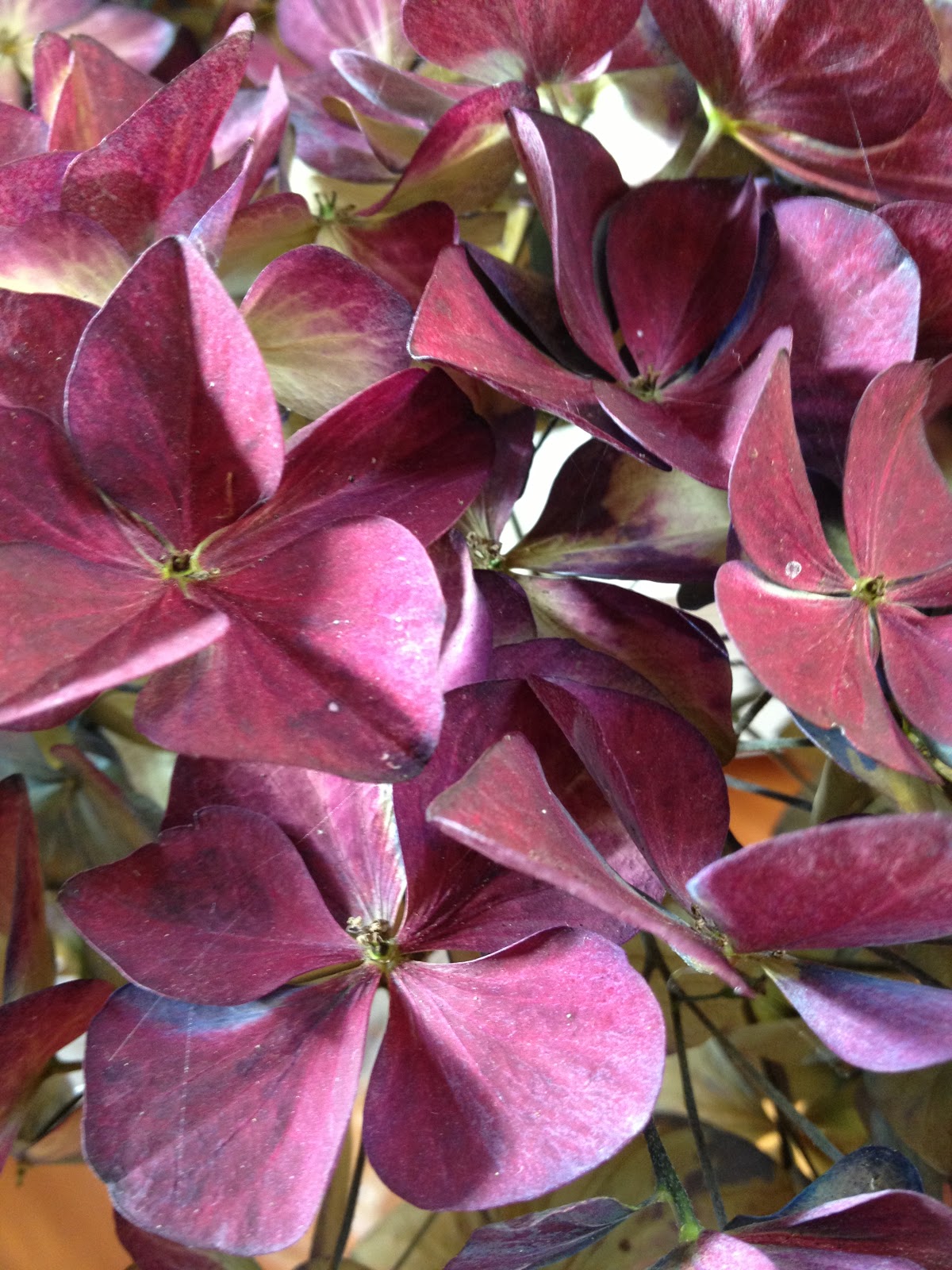 Meantime, here are some images of my first successful effort at drying hydrangeas without losing their color or texture. Kimmie led me this way: wait until the blooms are leathery and almost done, then strip the leaves and put the blooms in a vase without water.